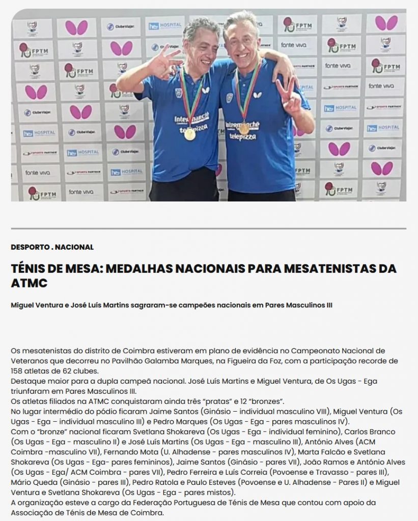 Campeões Nacionais Ano Clube / Atleta Título ____________________________________________________________________________________ 2025 Os Ugas A.D.C Ega Campeã Nacional de Equipas Veteranos 50-59 ____________________________________________________________________________________ 2025 Miguel Ventura/José Luis Martins (Os Ugas A.D.C. Ega) Campeões Nacionais de Pares Masculinos Veteranos III ____________________________________________________________________________________ 2024 Os Ugas A.D.C. Ega Campeã Nacional de Equipas Veteranos 50-59 ____________________________________________________________________________________ 2024 Miguel Ventura/José Luis Martins (Os Ugas A.D.C. Ega) Campeões Nacionais de Pares Masculinos Veteranos III ____________________________________________________________________________________ 2024 Svetlana Shokareva/Juliana Silvestre (Os Ugas A.D.C. Ega/AR Novelense) Campeãs Nacionais de Pares Femininos Veteranos II+III+IV ____________________________________________________________________________________ 2023 Carlos Paulo Branco/Ricardo Bispo (Os Ugas A.D.C. Ega) Campeões Nacionais de Pares Masculinos Veteranos II 2023 Miguel Ventura/José Luis Martins (Os Ugas A.D.C. Ega) Campeões Nacionais de Pares Masculinos Veteranos III 2023 Miguel Ventura (Os Ugas A.D.C. Ega) Campeão Nacional de Veteranos III Masculinos 2023 Santiago Almeida (AFA Arazede) Campeão Nacional Para Ténis de Mesa (Classe 7) 2022 José Luis Martins (Os Ugas A.D.C. Ega) Campeão Nacional de Veteranos I Masculinos 2021 Svetlana Shokareva/Carlos Branco (Os Ugas A.D.C. Ega) Campeões Nacionais de Pares Mistos Veteranos 2021 Svetlana Shokareva (Os Ugas A.D.C. Ega) Campeã Nacional de Veteranos Femininos 2019 Svetlana Shokareva/José Luis Martins (Os Ugas A.D.C.Ega) Campeões Nacionais de Pares Mistos Veteranos 2019 Svetlana Shokareva (Os Ugas A.D.C.Ega) Campeã Nacional Veteranos Femininos 1997 ACM Coimbra Campeã Nacional 2ª Divª de Equipas Seniores Masculinos 1995 Gonçalo Castanheira (ACM Coimbra) Campeão Nacional TOP 12 Jovem 1995 Gonçalo Castanheira / Elsa Rodrigues (ACM Coimbra / Câmara de Lobos) Campeões Nacionais de Pares Mistos Juniores Masculinos 1994 Sérgio Castanheira / Ricardo Oliveira (ACM Coimbra / GDM Aventino) Campeões Nacionais de Pares Cadetes Masculinos 1994 Sérgio Castanheira (ACM Coimbra) Campeão Nacional Dia Olímpico Ini/Cad Masculinos 1990 Gonçalo Castanheira / Sérgio Castanheira (ACM Coimbra) Campeões Nacionais de Pares Iniciados Masculinos até 11 anos 1971 Fernando Norberto Oliveira (Associação Naval 1º Maio) Campeão Nacional de Juniores Masculinos 1969 Fernando Calouro / Luis Silva (Ginásio Figueirense) Campeões Nacionais de Pares Infantis Masculinos até 15 anos 1968 Ginásio Clube Figueirense Campeão Nacional de Equipas Infantis Masculinos 1968 Jaime Santos / António Neves (Associação Naval 1º Maio) Campeões Nacionais de Pares Juniores Masculinos 1968 João Maças / Luis Silva (Ginásio Clube Figueirense) Campeões Nacionais de Pares Infantis Masculinos até 15 anos 1968 João Maças (Ginásio Clube Figueirense) Campeão Nacional de Infantis Masculinos 1967 Associação Naval 1º Maio Campeão Nacional de Equipas Juniores Masculinos 1967 Jaime Santos (Associação Naval 1º Maio) Campeão Nacional de Infantis Masculinos 1967 Jaime Santos / Gustavo Ponte (Associação Naval 1º Maio) Campeões Nacionais de Pares Infantis Masculinos até 15 anos 1967 José Ramalho / António Neves (Associação Naval 1º Maio) Campeões Nacionais de Pares Juniores Masculinos 1966 Associação Naval 1º Maio Campeão Nacional de Equipas Infantis Masculinos 1966 Associação Naval 1º Maio Campeão Nacional de Equipas Juniores Masculinos 1966 Luís Silva (Ginásio Clube Figueirense) Campeão Nacional de Infantis Masculinos 1966 José Ramalho / António Neves (Associação Naval 1º Maio) Campeões Nacionais de Pares Juniores Masculinos 1959 Ginásio Clube Figueirense Campeão Nacional de Equipas Meninas até aos 15 anos 1958 Gabriela Galamba (Ginásio Figueirense) Campeã Nacional de Meninas até aos 15 anos